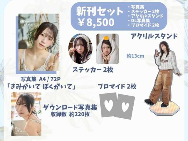 2025年12月31日 コミックマーケット107にて頒布した新刊セットです。 部屋着、ランジェリー、私服ポトレ…etc. グラビア感もありつつ、彼女感溢れる1冊となっております! 無邪気なりおもあどけない感じのりおも沢山楽しんでください♪ [内容] ・きみがいて ぼくがいて【写真集 A4/72ページ】 ・アクリルスタンド(高さ約13cm) ・ブロマイド2種 ・ステッカー2種 ・ダウンロード写真集(220枚収録) 上記5点セット ※宛名有りのサイン対応は受け付けておりません。 営業所留めは対応しておりません。郵便局留めを希望される場合は必ず備考欄にてお知らせ下さい。 また、1人で作業を行っている為、発送及び発送通知が遅くなる場合があります。ご了承ください。